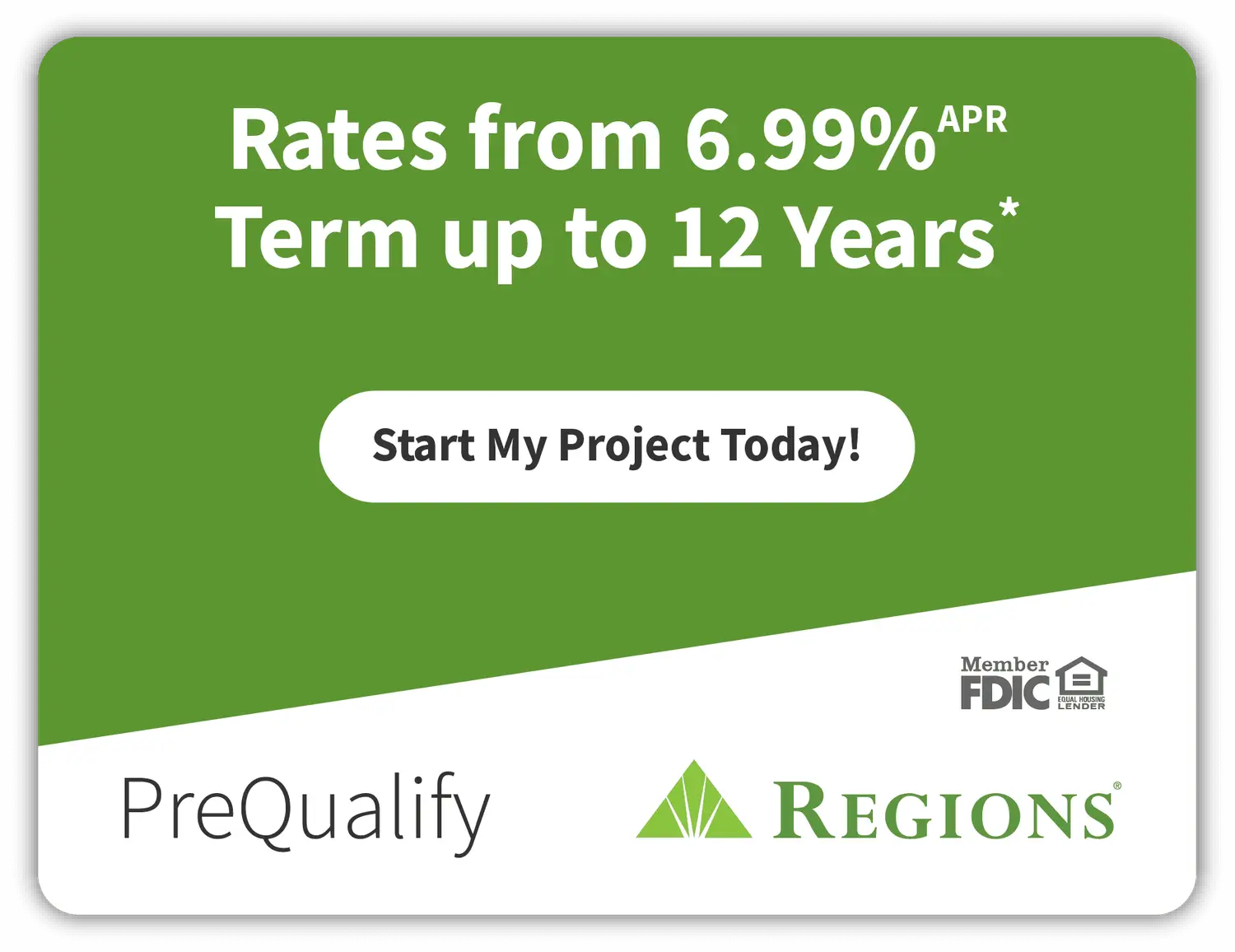 *Credit and loans provided by Regions Bank, Member FDIC, (650 S. Main St., Suite 1000, Salt Lake City, UT 84101) on approved credit, for a limited time. 19.99% fixed APR (provided however, APR will not exceed 15.99% for residents of New Jersey and 17.99% for residents of Florida and Wisconsin), effective as of February 2025, subject to change. Minimum loan amounts apply. Interest starts accruing when funds are disbursed. Interest waived if repaid in 365 days from first disbursement. When open line period ends, the balance becomes a fixed rate installment loan; repayment terms vary from 24 to 132 months. Actual loan term may be shorter if less than the full approved amount of credit is used. First monthly loan payment due 365 days after first disbursement. If no payments made during same-as-cash period and APR of 19.99%, monthly payments vary from $21.99 to $30.82 per $1,000 borrowed depending on term. The minimum monthly payment will be no less than $50.00.